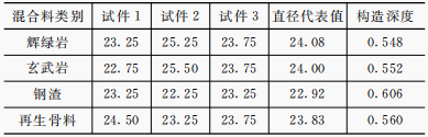 鋪砂法是測定路面的宏觀構造深度的一種方法反映路面高速行車時的抗滑性。按照《公路工程瀝青及瀝青混合料試驗規程》(JTGE20-2011)中鋪砂法的測試方法對輝綠巖、玄武巖、鋼渣和再生骨料等4種集料混合料車轍板進行構造深度測試,每組3塊試件。在對推鋪形成的圓面進行鋼尺測量后,將測得的直徑按照規范推薦公式進行計算,其測試結果如表1所示,其數據展示以及其與粗集料表面構造排序的對比。